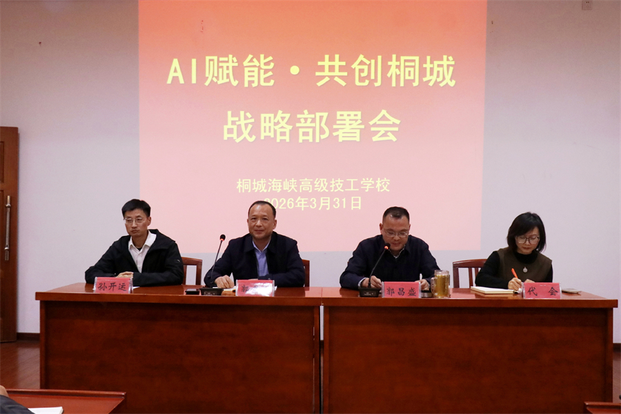 当AI浪潮席卷各行各业,教育领域正迎来前所未有的变革与机遇。为统一思想、明确方向、凝聚合力,抢抓时代风口,3月31日,桐城海峡高级技工学校召开“AI赋能·共创桐城”战略通气会,海峡科技集团公司董事长郭黄胜,桐城海峡高级技工学校校长郭昌盛、副校长孙开运、海峡集团办负责人代会等相关领导及全校教职工齐聚一堂,共赴一场关乎学校未来、关乎每一位教职工职业发展的“成长之约”。会议由桐城海峡高级技工学校校长郭昌盛主持。