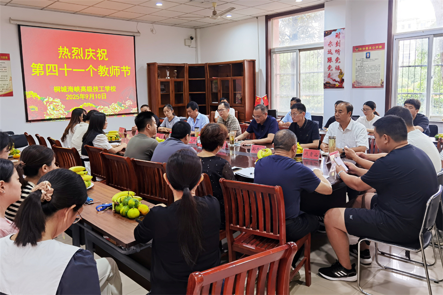 在第41个教师节来临之际,为进一步弘扬尊师重教、立德树人的校园风尚,9月10日,桐城海峡高级技工学校举行教师节庆祝活动。桐城市人力资源和社会保障局副局长章文斌,及市职业技能鉴定中心主任杨林光出席座谈会,桐城海峡高级技工学校校长郭昌盛及校全校教职工欢聚一堂,共同庆祝这一节日。