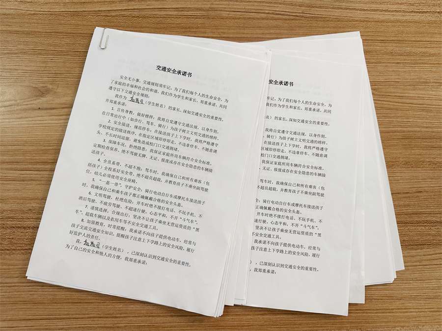 活动期间,各班还组织学生签订《交通安全承诺书》,通过书面承诺的形式,进一步强化学生自我约束意识。同时,通过LED屏滚动宣传,班主任定期沟通联系等方式,引导学生将安全出行理念融入日常,构建安全防护体系。